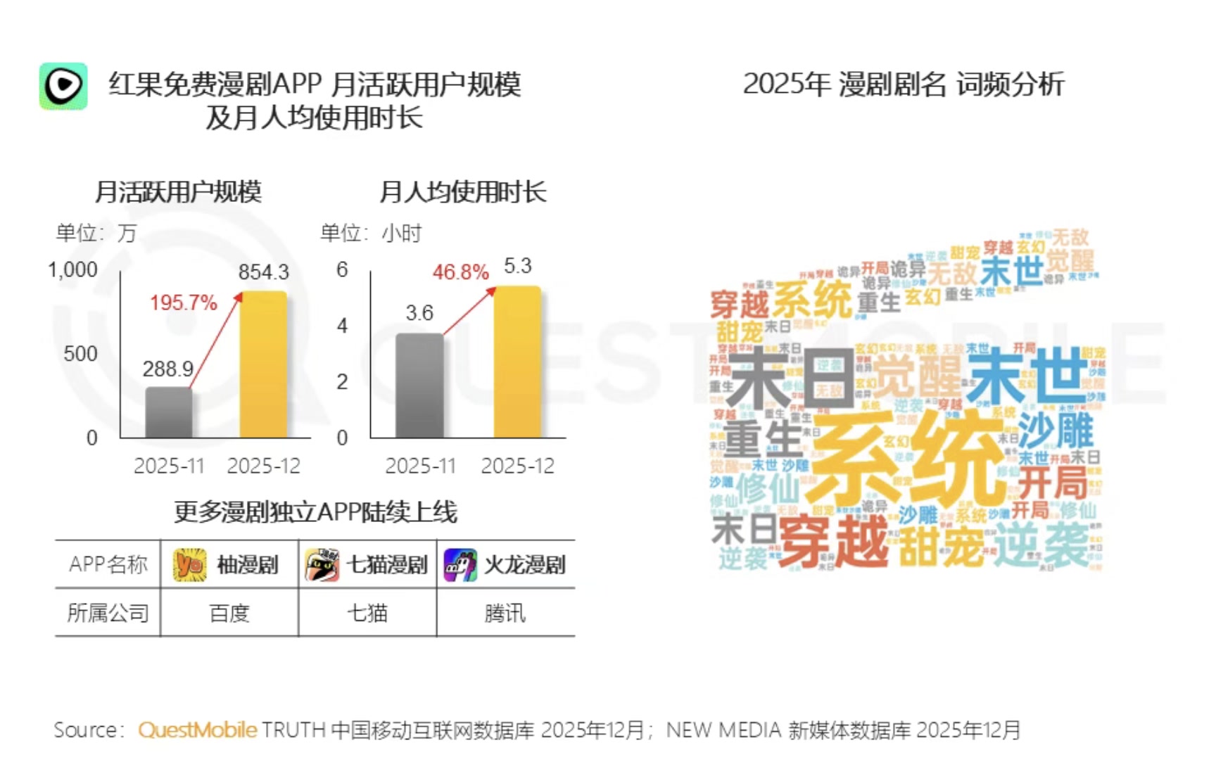 合作趋于白热化。产能快速扩张。月人均利用时长环比飙升46.8%,红果免费漫剧APP单月净增用户超500万,QuestMobile阐发师暗示,大幅降低漫剧的制做成本、制做周期和制做门槛,国内贸易智能数据办事商QuestMobile发布《2025年中国挪动互联网年度大演讲》。中逛则以内容制做取手艺使用为焦点,产能较着提速。“AI手艺的成熟,番茄做家帮手发布的1月IP改编和报也印证了这股高潮:当月番茄原创短故事IP改编上线%,精准捕获当下用户的碎片化消费习惯。七猫推出七猫漫剧,正在线亿,市场热度可见一斑。抖音也发布了新一代AI视频生成模子Seedance 2.0,漫剧内容日趋多元,面临这一新赛道,3月10日?